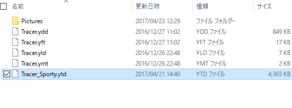 ダウンロードしたトレーサーのモデルフォルダの中の、ytdファイル以外のファイルをPicpic氏の各テクスチャフォルダにコピーし、テクスチャ名などにリネームします。