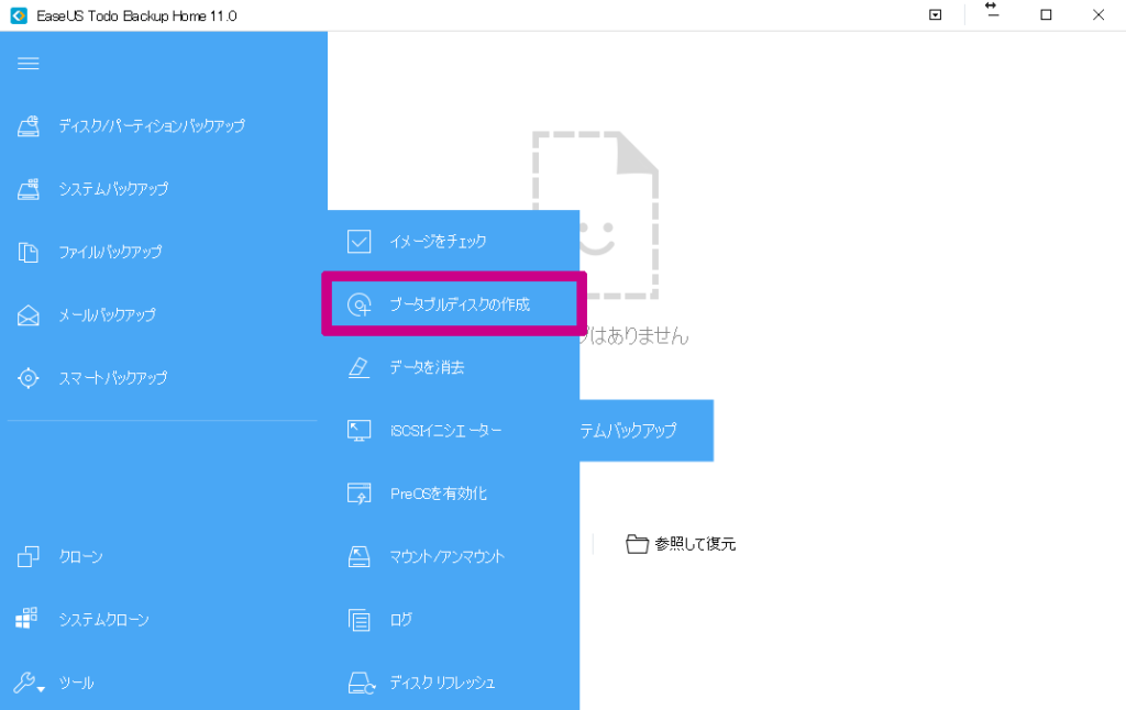 まずはメインの画面から「ツール」→「ブータブルディスクの作成」を選択します。